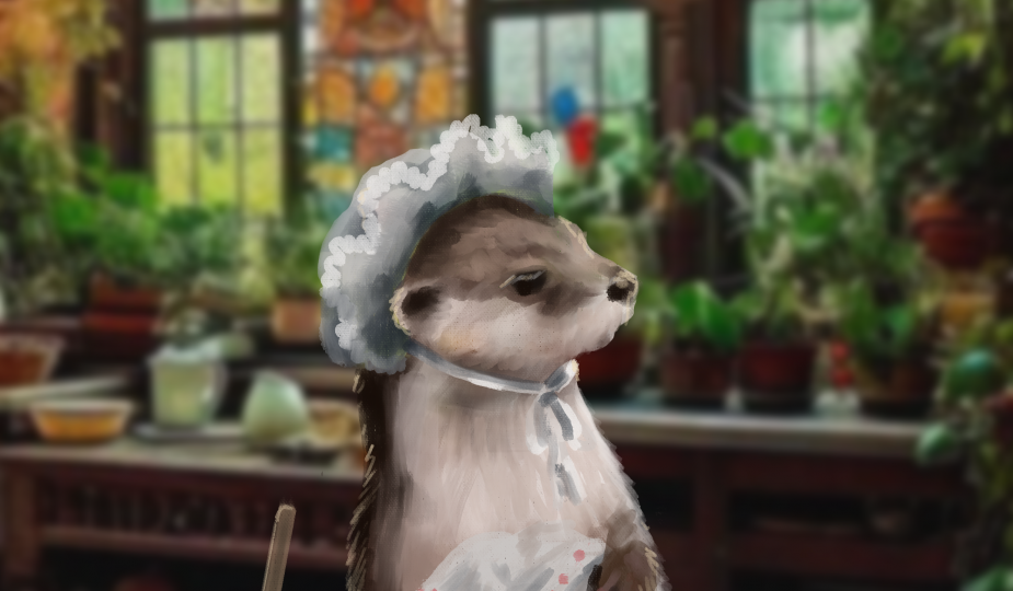 Procreate hat sehr viele Brushes (Materiales mit denen man Zeichnen kann), die außergewöhnliche Texturen haben wie Grass, Schnee oder Blätter. Diese passen jedoch nie 100% zum eigenen Stil. Mein Tipp ist, die Idee der Brushs zu nehmen, aber ein eigenes Ding daraus machen. Der Regen vor dem Fenster meines Otters ist mit der „Schneegestöber“-Brush dargestellt. Ich habe im Nachhinein Bewegungsunschärfe benutzt, sodass es wie fallende Tropfen wirkt. Der Busch vor dem Fenster ist mit der „Paper Daisy“-Brush angedeutet. Ich habe mit „Alphasperre“ noch aus dem Raum fallendes Licht auf die Blätter gebracht, sodass diese nicht hervorstehen, aber optisch ihren Platz im Bild finden.